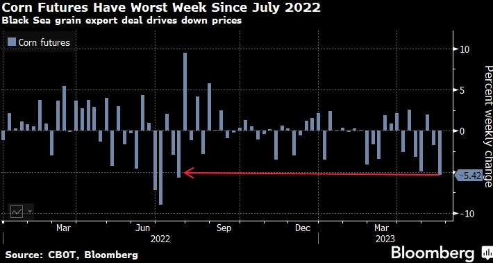 Фьючерсы на зерновые завершили минувшую неделю на многомесячных минимумах на фоне улучшения перспектив украинского экспорта и вялого спроса на сырьевые товары из США. Кукуруза на бирже в Чикаго на прошлой неделе упала в цене на 5,1%, что стало вторым недельным снижением подряд, после продления сделки по экспорту зерна из региона Черного моря, которая сохраняет открытым основной торговый маршрут как минимум на два месяца.