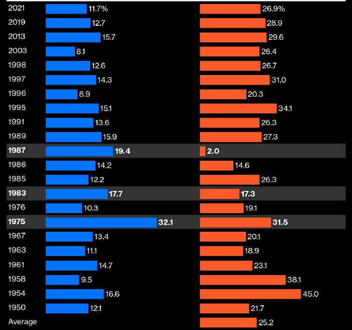 Процентный рост S&P 500 в первые 100 торговых сессий года (голубым) и по итогам всего года (оранжевым). Источник: Bloomberg