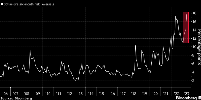 Разница в премиях шестимесячных опционов, которые защищают инвестора от снижения лиры и ее роста (risk reversals), поднималась в понедельник до рекордных 19% против 10,7% в январе, а сегодня опустилась до 18%, пишет Bloomberg.