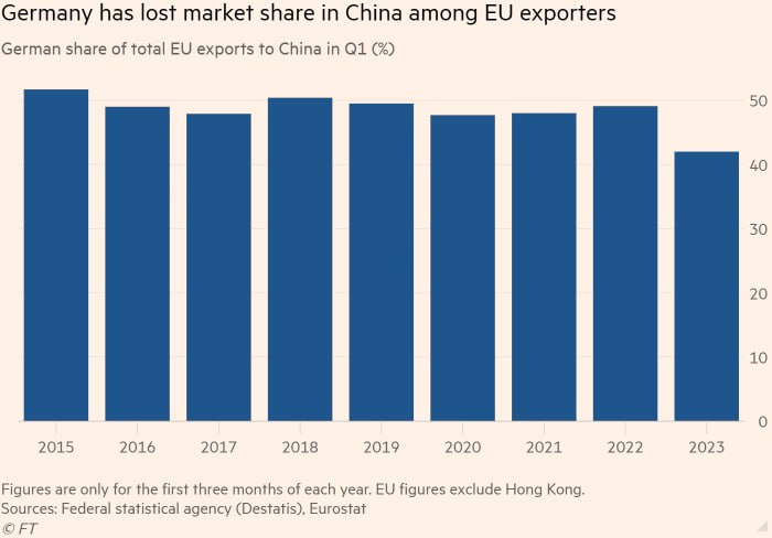 Германия, кажется, выделяется среди европейских стран, большинство из которых в этом году увеличили поставки в Китай, что говорит о том, что немецкие экспортеры теряют долю на своем втором по величине рынке за пределами Европы. По данным Евростата, экспорт из 27 членов ЕС в Китай в первом квартале вырос на 2,9% в годовом исчислении.