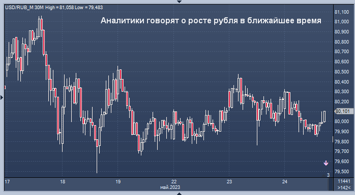 "Пять дней подряд рубль в паре с долларом консолидировался чуть выше отметки 80 руб. Амплитуда внутридневных колебаний пары затухает, прорисовывается фигура "треугольник". Все это говорит о том, что сегодня-завтра стоит ждать начала движения пары. Скорее всего, оно будет вниз. Сейчас рубль начнет получать усиленную поддержку со стороны налогового периода и немного меньшую - от увеличения требований с 1 июня к резервам банков. Но сильного роста российской валюты ждать не стоит. Ближайшая цель снижения пары "доллар-рубль" располагается в районе 76,5 руб./$1, а при ее пробое возможен уход к 75 руб./$1", - пишет руководитель отдела инвестиционного консультирования компании "Алор Брокер" Алексей Антонов.