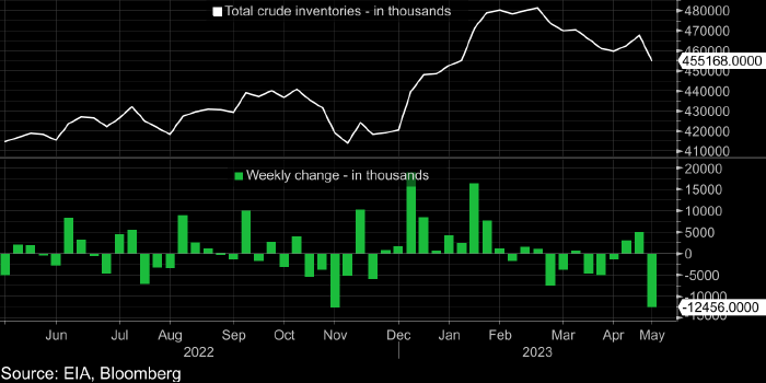 Коммерческие запасы нефти сократились на 12,456 млн баррелей (рекордное снижение с 25 ноября 2022 года) до 455,168 млн баррелей (самое низкое значение с 3 февраля 2023 года).