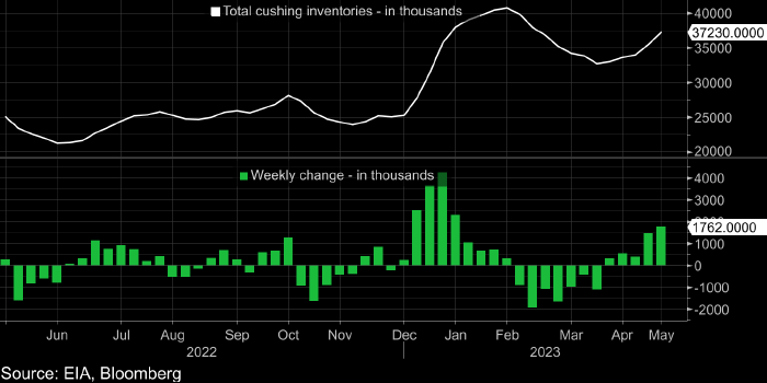 Запасы нефти в Кушинге выросли на 1,762 млн баррелей (рекордный рост с 27 января 2023 года) до 37,230 млн баррелей (самое высокое значение с 10 марта 2023 года).