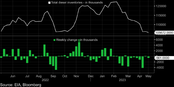 Коммерческие запасы дистиллятов сократились на 0,561 млн баррелей (рекордное снижение с 5 мая 2023 года) до 105,672 млн баррелей (самое низкое значение с 13 мая 2022 года).