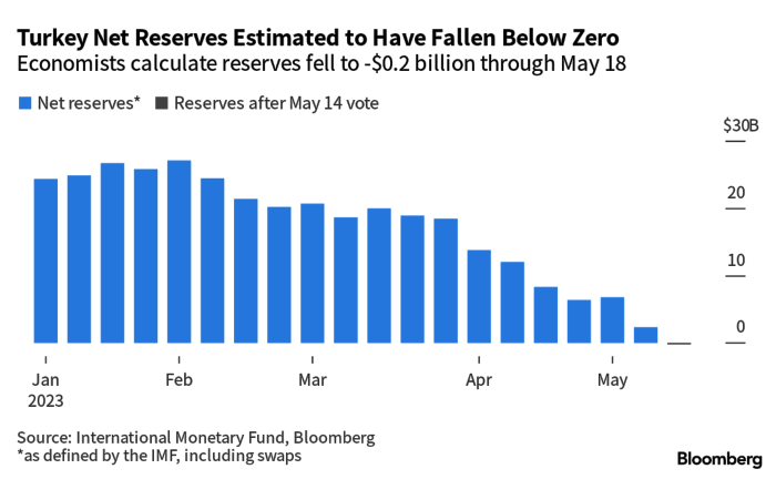 Центральный банк также наращивает интервенции на валютном рынке, подход настолько дорогостоящий, что, по оценкам экономистов, он помог снизить чистые резервы — по определению Международного валютного фонда — чуть ниже нуля в течение недели после первого тура выборов 14 мая.