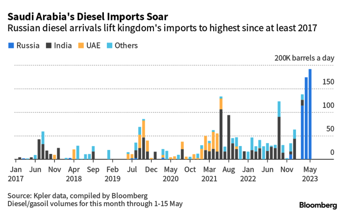 Саудовская Аравия скупает миллионы баррелей российского дизельного топлива, которое Европа больше не покупает, одновременно отправляя свои собственные поставки обратно покупателям в ЕС.