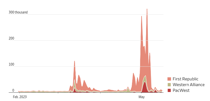 Федеральная резервная система повысила ставки, а акции банков продолжили падать. Согласно Vanda Research, индивидуальные инвесторы покупали акции PacWest всю неделю, надеясь получить акции подешевле, а затем снова подтолкнуть их вверх. Однако стратегия покупки на спаде не сработала, акции продолжали падать. По данным Hootsuite, PacWest упоминался в социальных сетях все чаще: почти 42000 сообщений со ссылками на банк в таких сетях, как Twitter, Facebook и Reddit. В предыдущую среду их было меньше 3000.