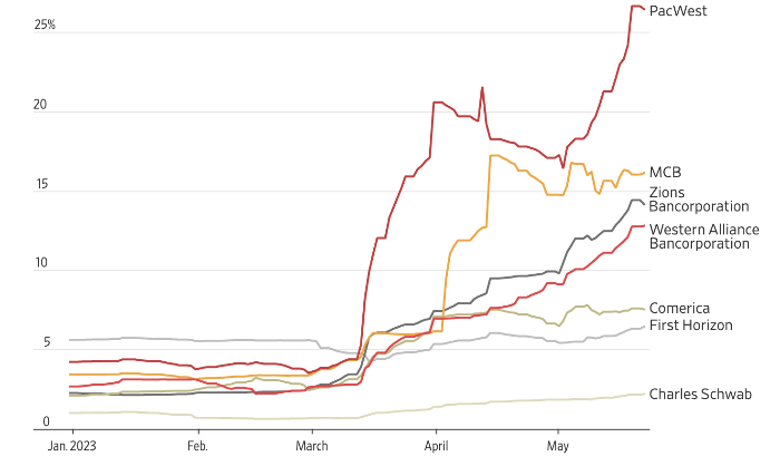 В этом году банковские акции стали мемными. С марта акции таких банков, как PacWest, торговались в широком диапазоне. Плохие новости, включая отток вкладов, толкали их вниз по спирали. Хорошие новости, такие как намеки на усиление государственной поддержки, поднимали их вверх.