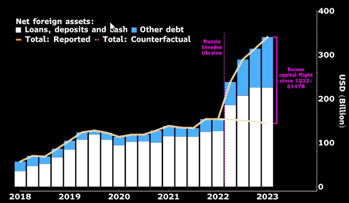 По нашим оценкам, в 2022 году совокупные чистые иностранные активы в виде кредитов, депозитов и прочего долга увеличились на 147 миллиардов долларов по сравнению с довоенной экспозицией.