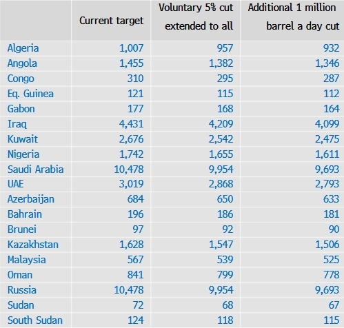 Один из возможных результатов сегодняшней встречи — формализовать объявленные в апреле добровольные сокращения — что эквивалентно сокращению примерно на 5% — и распространить их на всю группу. Распространение этого сокращения на остальных членов ОПЕК+ привело бы к сокращению общего целевого показателя на 2,1 миллиона баррелей в день. Но это повлекло бы за собой гораздо меньшее сокращение, немногим более чем на 300 000 баррелей в день, по сравнению с предполагаемым уровнем добычи в мае. Это также привело бы к тому, что Ангола и Нигерия добывали бы примерно на 275 000 баррелей в день меньше своих новых целевых показателей.