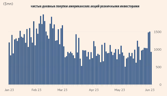 Объем чистой покупки акций 30 и 31 мая достиг $1,5 млрд в день. Это самый высокий показатель для розничных инвесторов за последние три месяца.