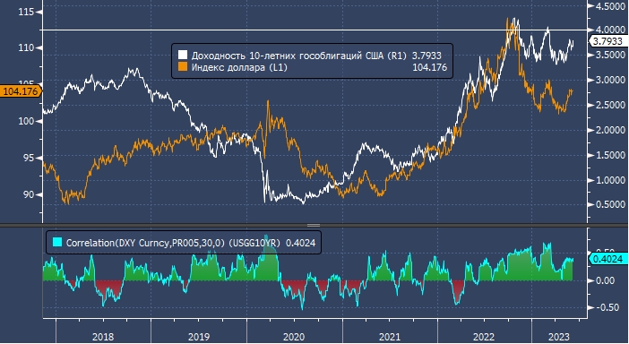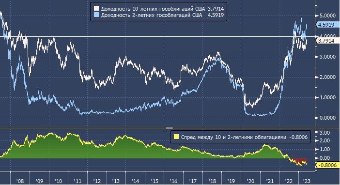 Доходность 10-летних казначейских облигаций в настоящее время торгуется около 3,7%. В период экономического роста США с 2009 по 2020 год она составляла в среднем 2,4%. Доходности десятилеток уверенно превысили порог в 4% в 2022 году, затем снизились до текущих значений. Однако средняя доходность по итогам 2022 г. составила всего 3,2%, средняя доходность с начала 2023 г. составляет около 3,6%. Последний раз среднюю по итогам года доходность выше 4% можно было наблюдать в 2007 году.
