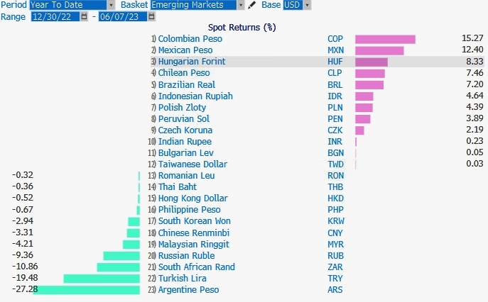 Динамика с начала 2023 г.: валюты развивающихся стран в % по отношению к доллару США