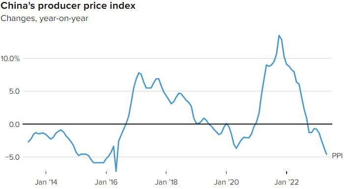 Индекс цен производителей в мае упал на 4,6%, что стало самым резким падением в годовом исчислении за семь лет, когда в мае 2016 года цены производителей в годовом исчислении упали на 7,2%.