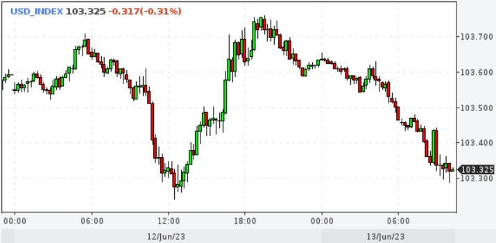 Индекс доллара США упал на 0,17% до 103,40, опустившись вблизи минимума понедельника в 103,24, самого низкого уровня с 23 мая.