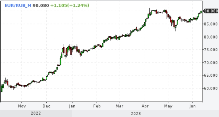 Поскольку евро вырос на форексе к доллару в понедельник, когда российский рынок был закрыт, сегодня мы наблюдаем подем единой валюты к рублю с опережением. Доллар падает на форексе постольку, поскольку участники рынка настраиваются на мягкий CPI в США сегодня и на паузу в ужесточении ДКП ФРС завтра, равно как и на подъем ставки ЕЦБ в четверг. Но рубль падает против большинства валют, включая падающий до минимума нескольких месяцев юань. Здесь, конечно же, повлияло сильное падение цен на нефть. И участников рынка это беспокоит.