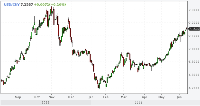 Юань достиг шестимесячного минимума в 7,1680 за доллар после решения по ставке, в то время как доходность базовых 10-летних государственных облигаций Китая упала до нового 7-1/2-месячного минимума.