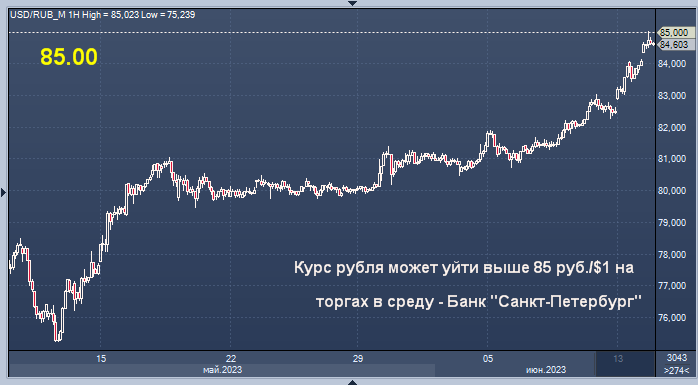 Курс пары доллар/рубль может превысить уровень в 85 руб./$1 на торгах в среду в отсутствие вербальных интервенций с выступлений на ПМЭФ, пишут аналитики банка "Санкт-Петербург".