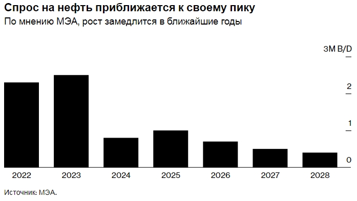 Спрос на нефть приближается к своему пику. По мнению МЭА, рост замедлится в ближайшие годы. Источник: МЭА.