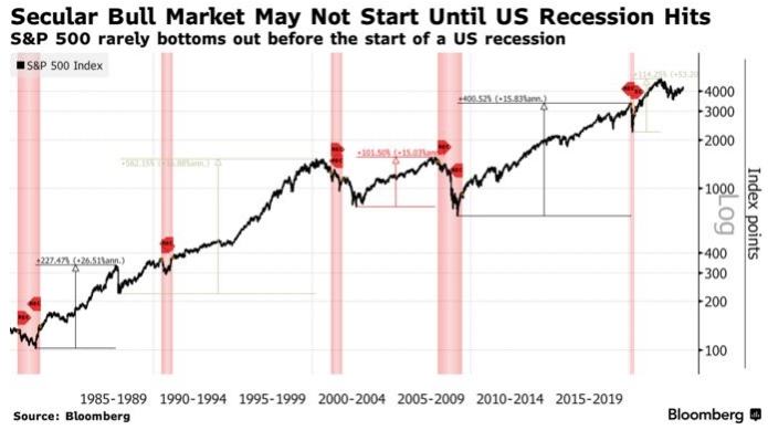 S&P 500 редко достигает дна перед началом рецессии в США.