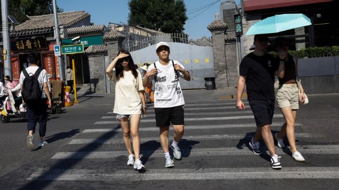 Люди переходят улицу во время желтого предупреждения о сильной жаре в Пекине, Китай, 21 июня 2023 года. REUTERS/Тиншу Ван