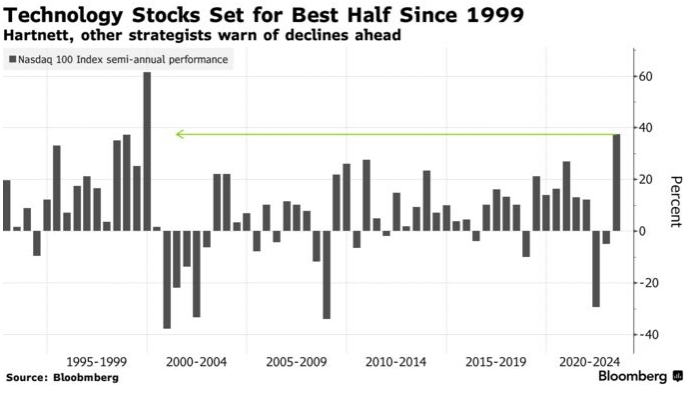 Акции технологических компаний находятся в лучшем полугодии с 1999 года | Хартнетт и другие стратеги предупреждают о предстоящем снижении