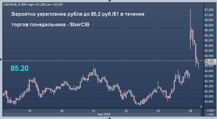 "Рубль в пятницу ослаб до 84,7 руб./$1. С вечера пятницы резко выросла политическая напряженность, и курс продажи американской валюты в банках превысил 100 рублей. Однако затем ситуация нормализовалась. Этим утром рубль ослаб до 87 руб./$1, но позже восстановился до 85,8. Мы ожидаем его укрепления в течение дня до 85,2 руб./$1", - пишут они.