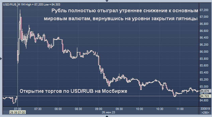 По мнению экспертов "Интерфакс-ЦЭА", основной причиной локального ослабления курса рубля, наблюдавшегося в самом начале торгов 26 июня, был рост политической напряженности в стране, вызванный событиями пятницы-субботы с участием ЧВК "Вагнер", которые были квалифицированы правоохранительными органами как попытка военного мятежа.