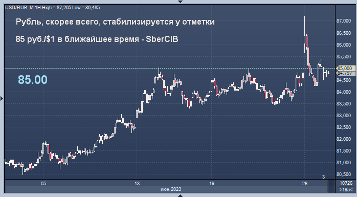"Рубль при открытии торгов в понедельник ослаб до 87 руб./$1 из-за политической напряжённости на выходных. Торги российская валюта завершила около 85 руб./$1, где примерно и остаётся этим утром. Учитывая недавнее заявление первого вице-премьера Андрея Белоусова об оптимальном курсе 80-90 руб./$1, рубль в ближайшее время, похоже, стабилизируется около 85 руб./$1, что станет уровнем его краткосрочного равновесия", - сообщают эксперты SberCIB Investment Research.