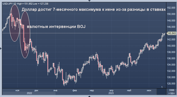 Япония вмешалась, чтобы поддержать иену в прошлом году, когда она ослабла выше уровня 145 за доллар. Недавно она снова резко упала, поскольку процентные ставки в США взлетели выше, чем в Японии, что сделало американские облигации более привлекательными.