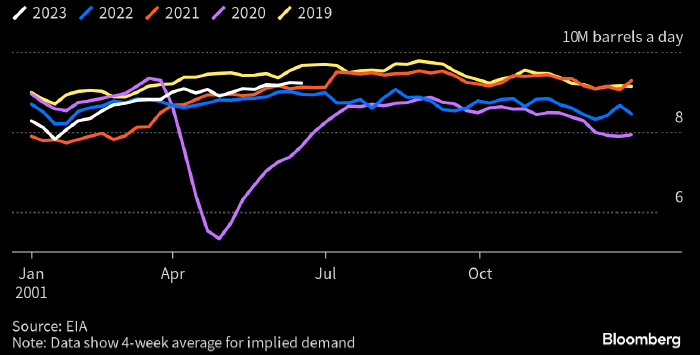 Среднее четырехнедельное значение спроса на бензин в США в млн баррелей в день по годам. Данные: Минэнерго США, источник: Bloomberg