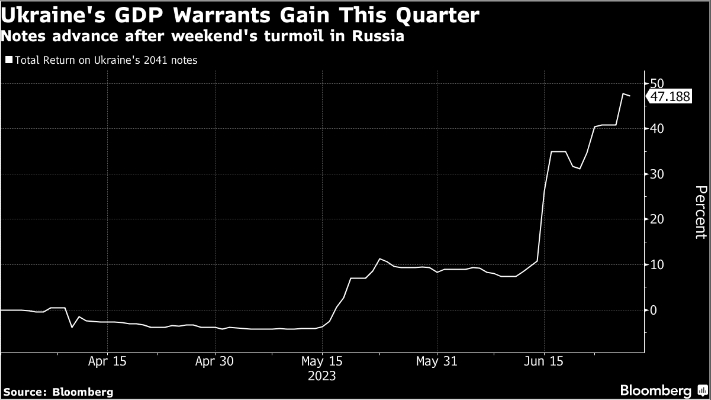 Попытка вооруженного мятежа ЧВК «Вагнер» повысила спрос украинские активы в расчете на то, что любой беспорядок среди высшего руководства России может пойти на пользу украинской стороне в разгоревшемся в 2022 году конфликте. В том числе выросли в цене варранты на ВВП. ВВП-варранты — это бумаги возникшие в результате схемы по реструктуризации долга.