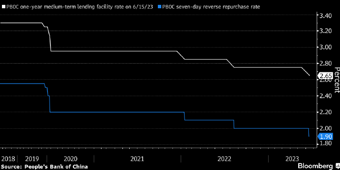 Банк Китая: ставка по однолетним кредитам (белым) и по 7-дневному обратному РЕПО (синим). Источник: Bloomberg
