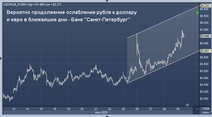 Вероятно продолжение ослабления рубля по отношению к доллару США и евро в ближайшие торговые дни, считают в банке "Санкт-Петербург".
