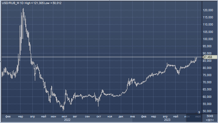 Доллар в четверг, 29 июня, укрепился к рублю до 87,465 — новый максимум с марта 2022 года. Евро поднялся до 95,522 рубля. Это также новый пик с 29 марта 2022 года — 15-месячный максимум. Юань поднимался до 12,049 — новый максимум с 7 апреля.