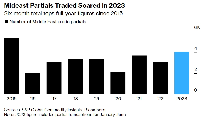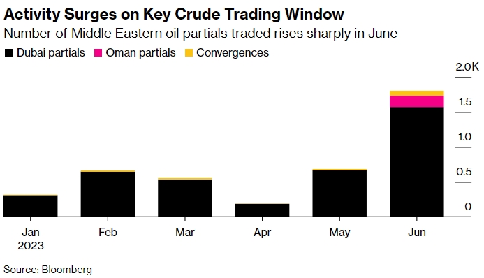 Согласно данным, собранным Bloomberg, в этом месяце в общей сложности 1732 так называемых «частичных» контракта на Дубай и Оман перешли к другому владельцу, что более чем в три раза превышает среднемесячный показатель с января по май. Каждая частичная сделка, представляющая собой сделку на 25 000 баррелей, помогает установить цену на ближневосточных рынках, таких как Дубай, которые составляют основу экспорта большей части сырой нефти из Персидского залива.
