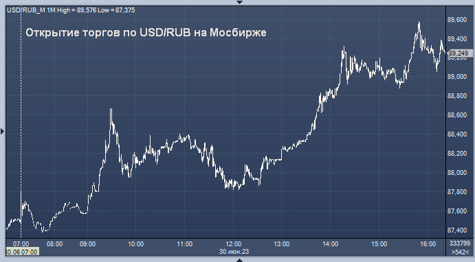Таким образом, по официальному курсу ЦБ доллар вырос к рублю на 1 рубль 35 копеек, евро вырос к рублю на 91 копейку, а китайский юань вырос к рублю на 17 копеек по сравнению с официальным курсом пятницы. Объем торгов на Московской бирже к 16:19 мск пятницы составил 1 257,8201 млрд рублей или 14 452,0376 млн долларов. Рубль сегодня ускорил снижение после того, как Банк России не выразил беспокойств по поводу девальвации. Эксперты кивают в сторону сокращения положительного сальдо торгового баланса.