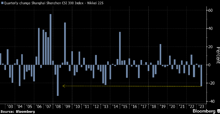 Разница в квартальной процентной динамике фондовых индексов CSI 300 и Nikkei 225. Источник: Bloomberg