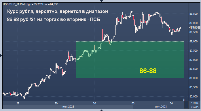 Вероятно снижение волатильности на валютном рынке во вторник на фоне выходного дня в США (День независимости) с ориентиром на укрепление национальной валюты ввиду сохраняющейся перепроданности рубля, актуально возвращение курса пары доллар/рубль в диапазон 86-88 руб./$1, считает аналитик Промсвязьбанка (ПСБ) Егор Жильников.