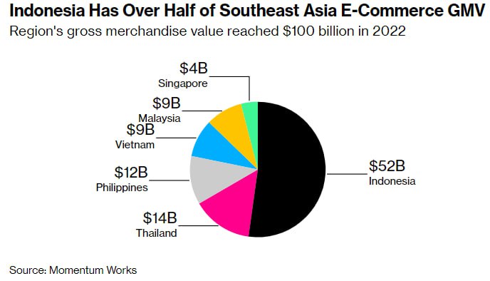 Индонезия занимает более половины GMV электронной коммерции в Юго-Восточной Азии. Валовая стоимость товаров региона в 2022 году достигла 100 миллиардов долларов. Источник: Momentum Works