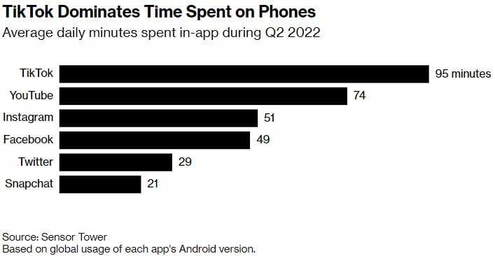 TikTok доминирует над временем, проведенным в телефоне. Среднее количество минут, проведенных в приложении в день во втором квартале 2022 г. Источник: Sensor Tower. На основе глобального использования версии Android каждого приложения.