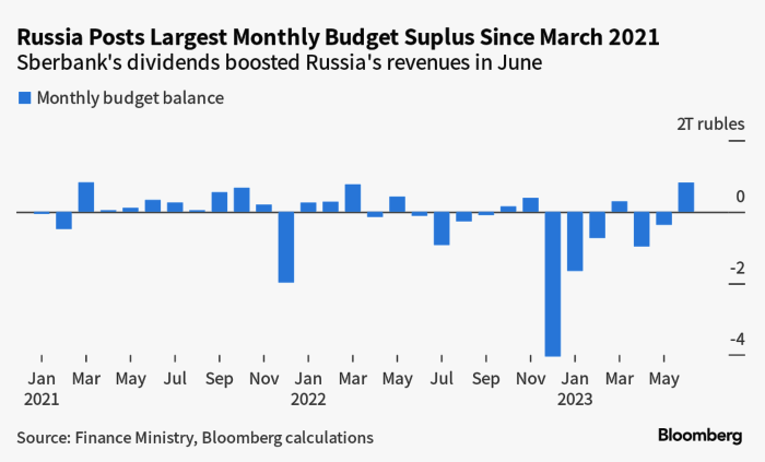 Изменение ситуации в прошлом месяце помогло сократить дефицит за первое полугодие 2023 года до 2,6 трлн рублей с 3,4 трлн за год за период до мая. Агентство Bloomberg Economics оценивает годовой дефицит России примерно в 3% от ВВП.