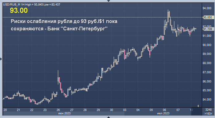 Риски роста курса пары доллар/рубль к уровню 93 руб./$1 пока сохраняются, но в дальнейшем поддержку национальной валюте могут оказать вероятное повышение ключевой ставки Банком России и июльский налоговый период, считают в банке "Санкт-Петербург".