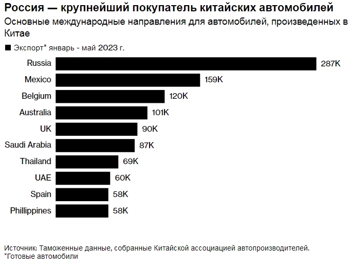 Согласно таможенным данным, опубликованным Китайской ассоциацией автопроизводителей во вторник, Китай экспортировал в Россию около 287 000 готовых автомобилей с января по май, что почти в два раза больше, чем следующий по величине и крупнейший пункт назначения прошлого года, Мексика, которая получила 159 000 автомобилей.