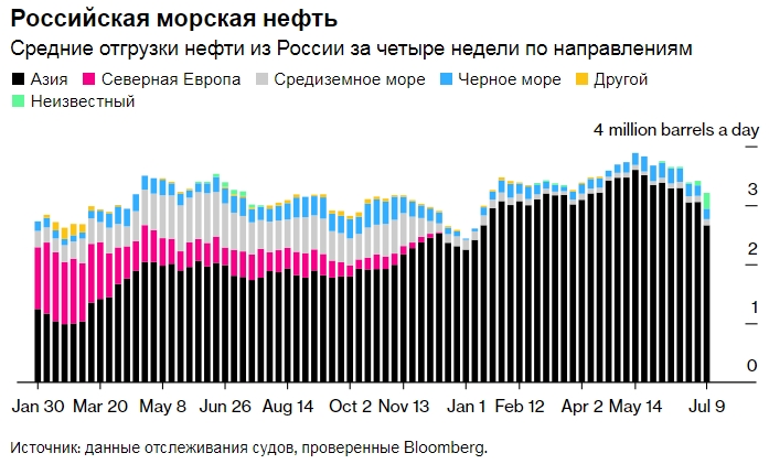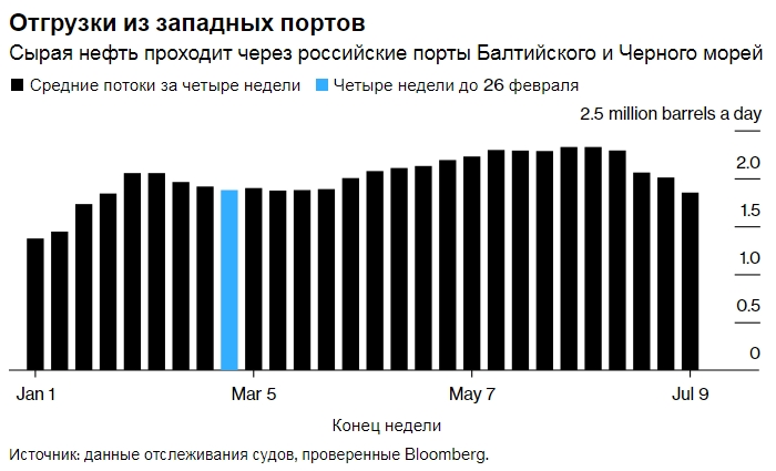 Поставки сырой нефти через западные порты России за четыре недели до 9 июля впервые упали значительно ниже среднего февральского уровня после резкого роста объемов в последующие месяцы, согласно данным отслеживания судов Bloomberg, которые подтверждаются другими источниками данных.