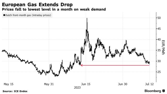 Базовые фьючерсы в Нидерландах упали на 2,8%, продолжив падение на этой неделе. В то время как в Европе в ряде стран установилась жаркая погода, что увеличивает потребность в охлаждении помещений, более высокие, чем обычно, запасы на континенте помогают держать цены на газ под контролем. По данным BNEF, недавнее снижение сделало экспорт сжиженного природного газа из США более выгодным для азиатских рынков.