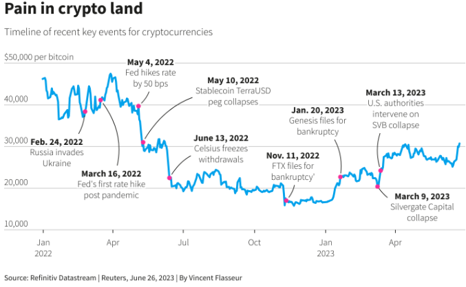 В прошлом году криптоиндустрию потрясла серия банкротств крупных криптокомпаний, включая ведущую американскую биржу FTX. Инвесторы остались с большими убытками, поскольку цены на токены резко упали, а различные фирмы заморозили вывод средств клиентами.