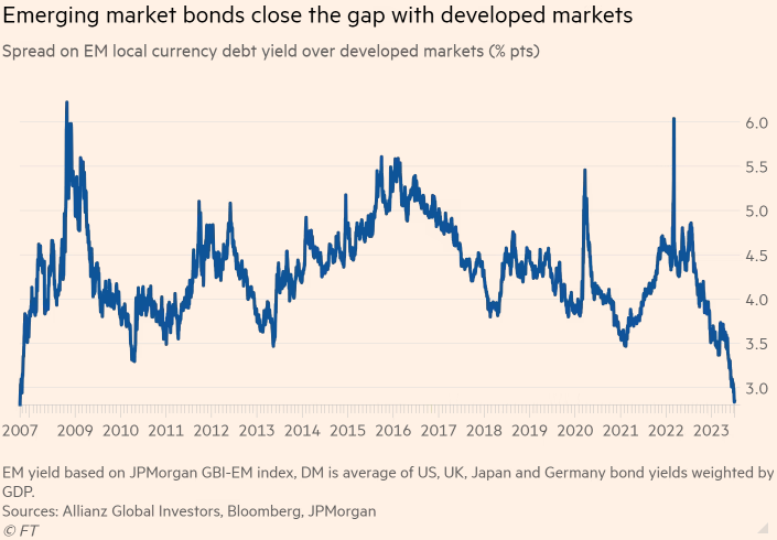 Разрыв в стоимости государственных заимствований между странами с формирующимся рынком и развитыми рынками сократился до самого низкого уровня с 2007 года, поскольку инвесторы рассчитывают на неизбежное снижение процентных ставок в некоторых крупных странах с формирующимся рынком и дальнейшее ужесточение на западе.