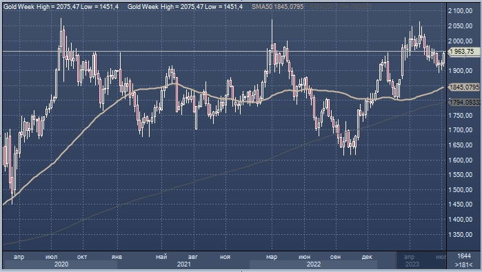 Золото подорожало по итогам недели, поскольку индекс доллара обновил минимум с апреля 2022 года на этой неделе, упав ниже психологического уровня 100 пунктов. На торгах в Азии в пятницу, 14 июля, золото достигало максимума почти за месяц ($1963,75/унц. — пик с 16 июня), но затем с началом торгов в Европе подешевело до $1957,9/унц.