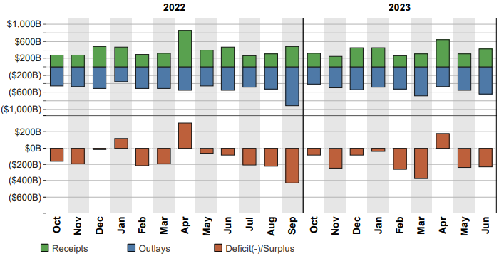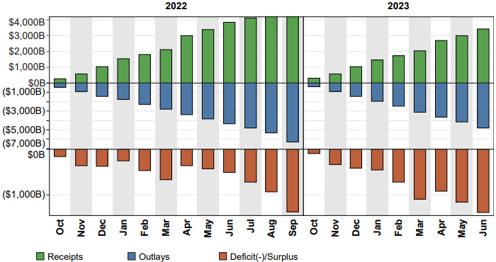 За девять месяцев текущего финансового года совокупный дефицит бюджета США составил $1,393 трлн, что является третьим рекордным значением за всю историю (данный показатель был выше только в 2020 и 2021 финансовых годах).